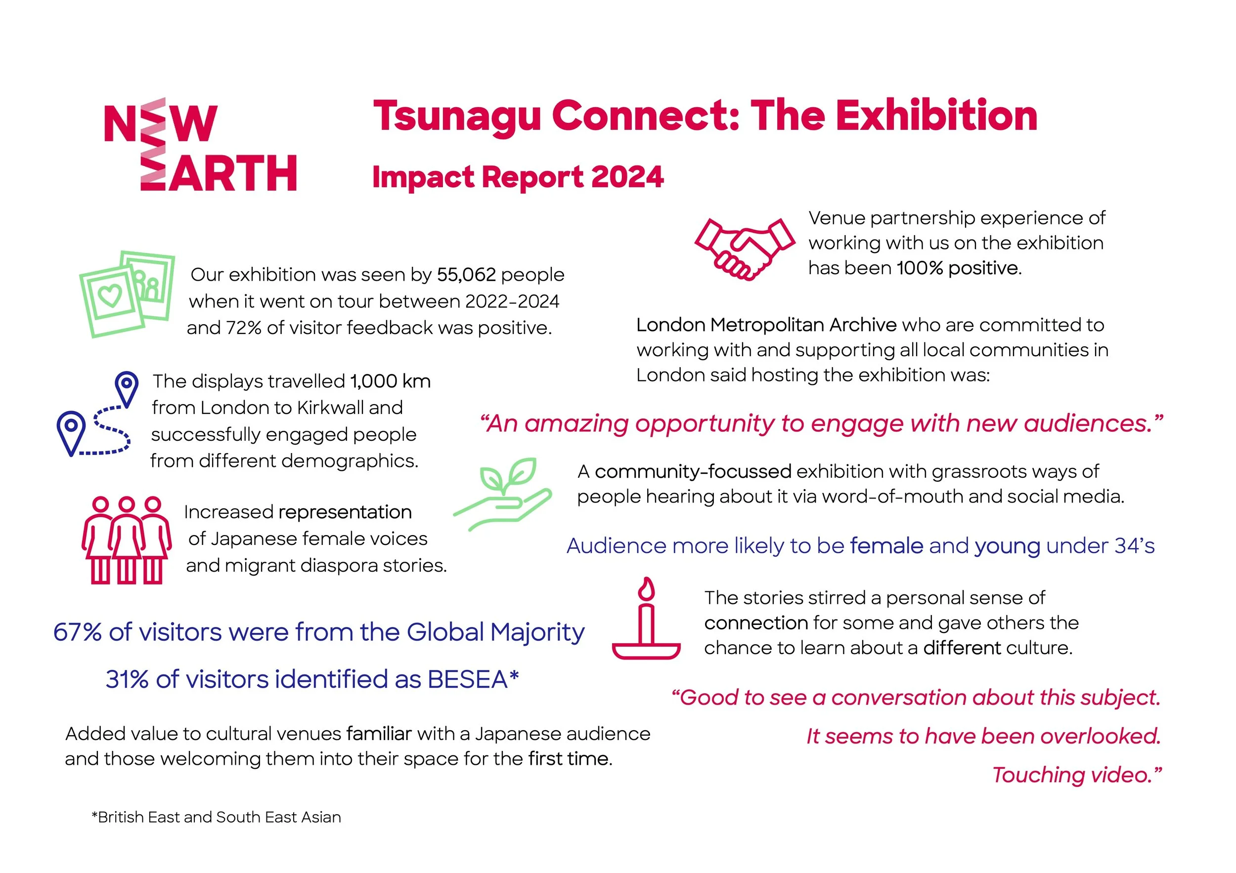 An Impact Report produced for New Earth Theatre company who work with British East and South East Asian (BESEA) artists. Tsunagu/Connect: The Exhibition was a multi-phased multi-generational project recording the often untold oral histories of Japanese women who left Japan and settled in the UK post-1945.